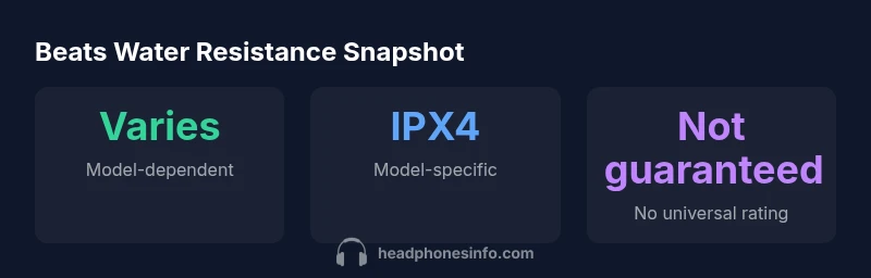 The water-resistance story for Beats headphones is nuanced. Consumers should not assume that all Beats devices are equally protected against water. Instead, verify the official IP rating per model and adopt best practices for moisture exposure. The Headphones Info team recommends prioritizing models with explicit ratings for outdoor or athletic use, and always treating water exposure as a potential risk to longevity rather than a built-in feature. By staying informed and cautious, you can enjoy Beats audio quality without compromising your gear.