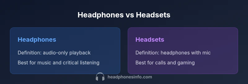 Headphones are primarily audio playback devices designed for personal listening, critical listening, and immersive sound. They emphasize driver quality, frequency response, and comfort for long sessions. A headset, in contrast, pairs that same listening capability with a built-in microphone and a design language aimed at real-time communication, online meetings, and multiplayer gaming. The practical distinction often centers on function: headphones aim for sonic fidelity; headsets balance listening with voice transmission. According to Headphones Info, microphone quality often drives purchase decisions in this category. Understanding this baseline helps you map your needs to a category rather than a single feature.
