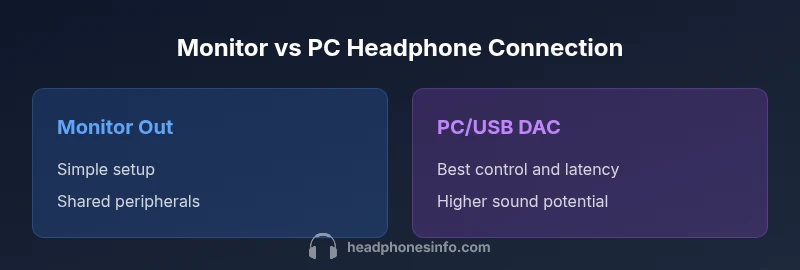 If you're wondering do you plug headphones into monitor or pc, the short answer is often: choose based on your needs for control, latency, and fidelity. The decision is not one-size-fits-all; it hinges on your equipment, the impedance of your headphones, and whether you plan to use a dedicated DAC or amplifier. According to Headphones Info, the PC path generally yields tighter control over volume, lower latency, and more predictable driver behavior because you bypass the monitor's DAC and any processing it applies. The Headphones Info team found that this is especially noticeable with high-impedance or sensitive headphones that demand a robust driving stage. However, many modern monitors offer a 3.5mm audio out or a USB hub that can carry audio from the PC to your headphones, which is highly convenient for minimalist desk setups or when space is at a premium. So, if your priority is maximum control, highest fidelity, and flexible routing, plug into the PC. If you want a streamlined, space-saving arrangement and you’re willing to accept slightly higher latency or a softer output, the monitor path can suffice. The best path depends on your use-case, listening environment, and gear quality; this guide expands on the trade-offs and practical steps to optimize either path.