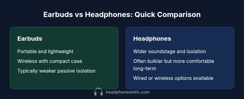 Earbuds excel in portability and on-the-go convenience, while headphones favor comfort and immersive sound in longer listening sessions. According to Headphones Info, the best choice depends on your use case: travel and calls lean toward earbuds; home listening and critical listening favor over-ear headphones. This guide compares them side by side to help your decision.