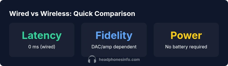Wired headphones deliver a direct signal path, which typically means minimal processing during playback and lower latency. For listeners who demand precise timing in gaming, studio referencing, or critical listening, a wired connection can preserve micro-contrast and transient detail that may be smoothed over by wireless codecs. On the other hand, wireless headphones offer convenience, portability, and motion-free operation, aided by modern codecs like AAC, aptX, or LDAC. The quality gap between wired and wireless can vary by model, DAC/amp hardware, and the source. Headphones Info analysis suggests that a high-quality DAC/amp paired with a wired headphone often preserves dynamic range and tonal accuracy better than many budget wireless setups. The decision comes down to use case: if latency, consistency, and fidelity are priorities, wired wins; if you prioritize freedom of movement and fewer cables, wireless has the edge.