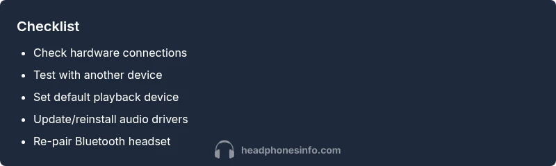 According to Headphones Info, when headphones aren’t working on a laptop, the root cause typically falls into three buckets: hardware connection, drivers, or software settings. This article uses a problem-solution approach to help you diagnose quickly and avoid unnecessary replacements. Throughout, you’ll see practical steps for both wired and wireless setups, plus a simple test you can perform on reboot. The standard checklist to tackle headphones not working on laptop begins with the most accessible checks and progresses toward deeper troubleshooting. Remember: the goal is to restore audio with minimal risk to your system. If you still can’t get sound after following these steps, professional help may be needed. First, confirm the problem by trying the headset on a different device and noting whether the microphone also fails.