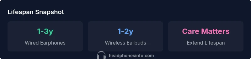 How long earphones last depends on type and care. According to Headphones Info Analysis, 2026, wired earphones commonly last about 1 to 3 years with regular use, while wireless earbuds typically show 1 to 2 years of reliable performance before noticeable battery or driver degradation. Proper handling and storage can push lifespans higher.