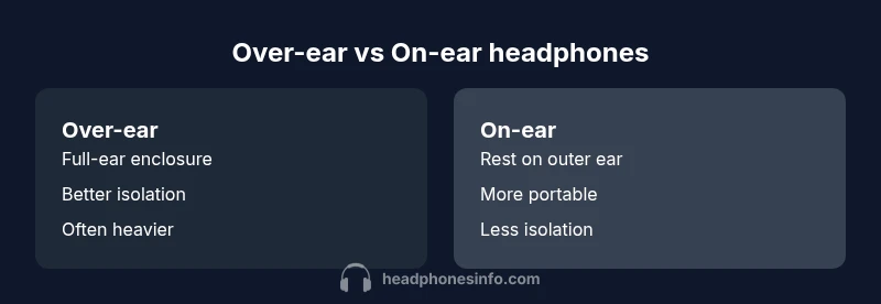 According to Headphones Info, over-ear headphones generally deliver better comfort and passive isolation due to larger cups that enclose the ears, while on-ear models trade some isolation for lighter weight and a smaller footprint. For many listeners, over-ear is the safer choice for long listening sessions and immersive sound, but on-ear can be preferable in tight spaces or when portability matters. This quick comparison highlights the core trade-offs to guide your first pass at a decision.