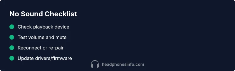 This usually means the output is not set to the headphones, the device is muted, or there is a driver/firmware issue. Bluetooth glitches can also cause a silent connection. Follow the steps in this guide to isolate the cause.
