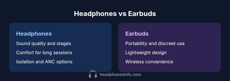 According to Headphones Info, the question of why headphones instead of earbuds often boils down to comfort during extended listening, tonal balance across genres, and the level of isolation you need in your environment. The Headphones Info team found that most listeners experience noticeably better bass control, wider soundstage, and a more stable seal with over-ear headphones, especially for critical listening at home or in the studio. This section sets the stage for a deeper, evidence-based comparison by clarifying typical use cases—from immersive music sessions to quick commutes—and by naming the key trade-offs that will drive your choice. The goal is not to declare a universal winner, but to align gear with your listening habits, room acoustics, and budget constraints while keeping the keyword why headphones instead of earbuds central to the discussion.
