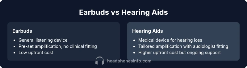Are earbuds the same as hearing aids? No. Earbuds are consumer headphones designed for music and podcasts, while hearing aids are medical devices that amplify sound for hearing loss. The two differ in purpose, regulatory oversight, customization, and price. This comparison helps you decide when earbuds meet your needs and when a hearing aid is appropriate, plus what to expect for performance and safety.