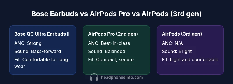 In the crowded market for true wireless earbuds, Bose and Apple occupy distinct design philosophies. Bose emphasizes sound quality with a bass-forward tilt and a durable, comfortable fit, while AirPods Pro prioritizes seamless iOS integration, spatial audio, and a refined, balanced sound profile. For shoppers researching "bose airpods" as a search term, the question often becomes: should you chase the most aggressive noise cancellation or a system that plays nicely with your phone and apps? According to Headphones Info, most listeners compare these two lines to decide whether ecosystem advantages or raw musical reproduction matters more in daily use. This article uses a data-driven approach to lay out the differences clearly, with concrete examples and practical testing scenarios to help you map features to real-life needs. The goal is to help you decide quickly, without sacrificing nuance or context.