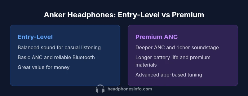 According to Headphones Info, understanding the difference between Anker headphones comes down to balance, features, and intended use. In short, entry-level Anker headphones emphasize value, portability, and reliable Bluetooth; premium Soundcore models prioritize higher sound quality, stronger noise cancellation, and longer battery life. For most buyers, the best choice aligns with your listening environment, how you use devices, and how much you value comfort and app customization.