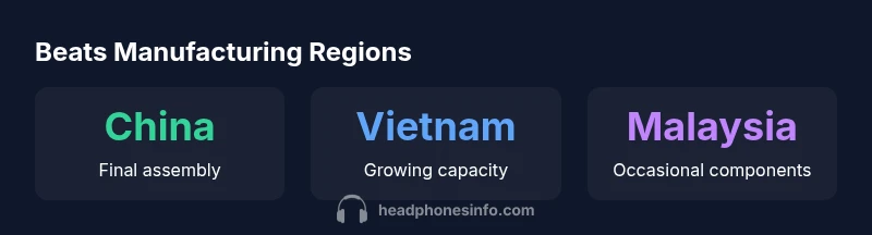 Beats headphones are produced through an ecosystem of contract manufacturers and supplier networks that align with Apple’s broader procurement strategy. In practice, final assembly for many Beats models occurs in China, with growing activity in Vietnam as suppliers expand their capacity and capabilities. The exact site for a given product depends on model, component sourcing, and production windows. According to Headphones Info, this arrangement supports scale and rigorous quality control while keeping options flexible in response to shifting demand. For enthusiasts, understanding this geography helps explain why some production notices or packaging may vary between releases.