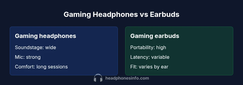 In the world of gaming headphones earbuds, the core decision often comes down to where you game, how you move, and what you value most in sound and communication. This guide compares two dominant forms of game audio gear: gaming headphones and gaming earbuds. You’ll see how each category stacks up in soundstage, mic quality, comfort, latency, and practicality. According to Headphones Info, the choice between these two options is not simply a matter of price, but of context—desk battles versus on-the-go play. The goal here is to help you map your typical gaming sessions to the gear that yields the best overall experience. Consider how often you game at a desk, in a commute, or during travel, and how important mic clarity, noise isolation, and latency are for you. The information here reflects the Headphones Info approach: data-informed, user-centered, and focused on real-world usage scenarios. When you see terms like gaming headphones earbuds, think of two distinct forms of gaming audio gear with overlapping capabilities but different strengths for different settings.