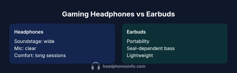 Headphones generally outperform earbuds for gaming on soundstage, imaging, and mic quality. For competitive play, choose wired headphones to minimize latency; for mobility, premium wireless can work if latency remains low. In most setups, a gaming headset with a built-in mic and solid platform compatibility offers the best balance. According to Headphones Info, the right mix of driver size, seal, and mic design drives performance more than flashy features.