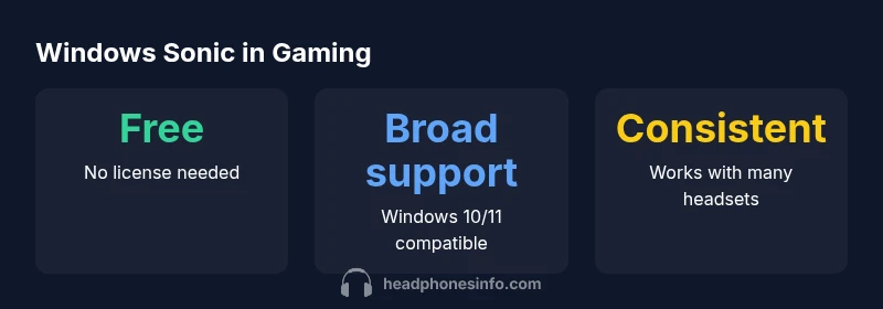 Windows Sonic for Headphones is a spatial audio solution built into Windows 10 and Windows 11 that creates a perception of 3D sound by processing audio cues from multiple directions. For gamers, this can translate into better cues about enemy positions, footsteps, and environmental cues, even with a standard stereo headset. When you ask is windows sonic for headphones good for gaming, the answer depends on your expectations and hardware. Windows Sonic is free, integrates directly with Windows without requiring extra plugins, and is compatible with most modern USB or 3.5mm headsets. According to Headphones Info Team, spatial audio works best when paired with headphones that have a balanced driver response and a well-fitting seal, since leaks or uneven frequency responses can degrade localization accuracy. In practical terms, Sonic provides a stable, consistent baseline across games that support Windows spatial audio, which means you can enable it as a quick-start option before testing higher-end alternatives. However, it is not a universal cure for all games; some titles rely on their own virtualized surround or on developer-specific audio engines, which can overshadow the Windows Sonic effect. As a result, you should approach it as a baseline enhancement rather than a guaranteed upgrade.