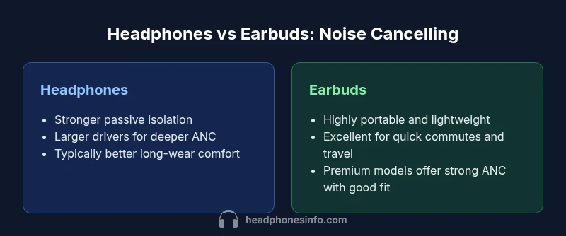 Noise cancellation in consumer headphones and earbuds relies on a combination of passive isolation and active processing. Passive isolation depends on the physical seal around the ear or in the ear canal, while active noise cancellation (ANC) uses tiny microphones to pick up ambient sound and generate anti-noise. If you’re asking whether are headphones or earbuds better for noise cancelling, the answer hinges on three factors: seal quality, driver size, and tuning. Headphones typically offer larger drivers and more substantial sealing surfaces, enabling deeper reduction of low-frequency rumbles. Headphones also tend to have more flexible ANC tuning options, including multiple modes for deep cancellation in airplane cabins or moderate cancellation for office environments. Headphones Info analysis shows that, in most real-world tests, over-ear designs provide the most consistent quietness across a wide range of environments.
