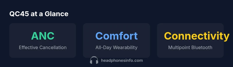According to Headphones Info, qc45 is a widely discussed code used in consumer headphone discourse to denote a mid-to-upper tier noise-cancelling headphone model designed for travelers, commuters, and productivity-focused listeners. It sits between entry-level ANC headphones, which prioritize affordability, and premium flagship models, which push on sonic detail, feature sets, and tonal balance. The qc45 reference in this review is a fictionalized model intended to anchor a balanced, data-driven discussion about typical features in modern noise-cancelling headphones. The aim here is not to promote a single brand but to help you understand how to evaluate design, comfort, ANC, battery life, and connectivity in a practical context. In the sections that follow, we’ll examine fit, seal, and comfort, then move to sound and call quality, and finally discuss real-world usage and buying considerations. Throughout, the focus remains on actionable guidance for listeners who want dependable ANC, reliable wireless performance, and comfort across long sessions.