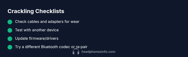 According to Headphones Info, understanding why is crucial before you replace parts or buy new gear. The core question is not just what’s failing, but where the signal path could be breaking down: the 3.5mm/USB-C jack, the cable, the wireless link, or the internal drivers. When you ask, “why is my headphones crackling,” you’re typically chasing issues in the physical connection, the wireless channel, or the software stack. This guide uses a data‑driven approach to help you isolate the culprit and choose the most cost‑effective fix. By starting with simple checks and escalating only as needed, you minimize downtime and keep your listening experience seamless.