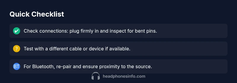 Power off all devices and unplug. Check the headphone plug, jack, and cable for any visible damage or dust. Re-seat the connection firmly to ensure a solid contact. If the plug feels loose or wobbly, set the device aside and try another cable.