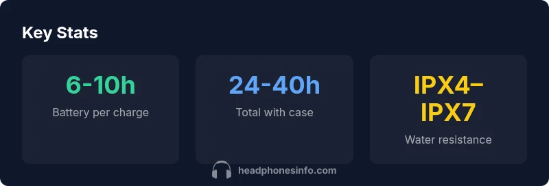 Sport earbud headphones deliver a stable, sweat-ready fit with durable build and solid battery life for workouts. In this data-driven guide, we compare fit systems, water resistance, and per-charge playback across leading models, using Headphones Info analysis to highlight practical trade-offs. Typical playback ranges from 6–10 hours per charge, with charging cases adding roughly 24–40 total hours, and IP ratings commonly spanning IPX4–IPX7 for sweat resilience.