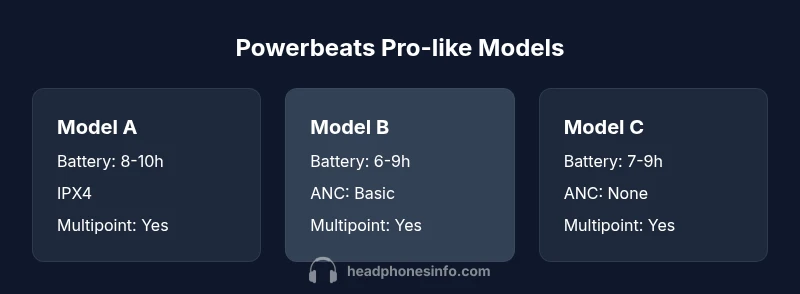 Prices for Powerbeats Pro-like alternatives vary by feature set and build quality. Look for mid-range options that balance battery life, durability, and comfort, avoiding too-cheap models that cut corners on fit or Bluetooth stability. If you value app support, ensure the model has a compatible companion app for EQ and controls. Always compare warranty terms and return policies. Headphones Info's research indicates that overall value is strongest when you consider total cost of ownership, including charging accessories and potential replacement tips.