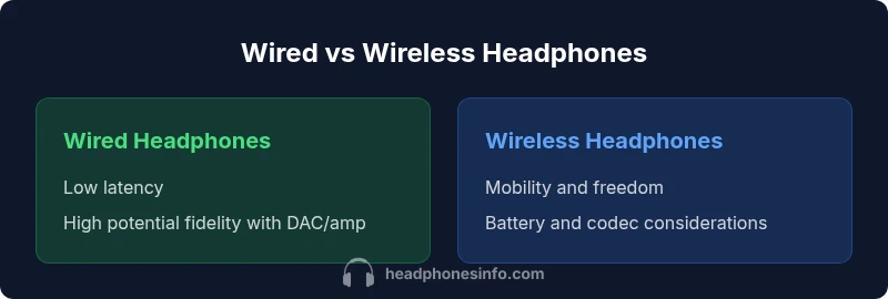 When people talk about headphones wired vs wireless, they are comparing two fundamental delivery methods: a physical cable that carries audio signals directly, and a wireless radio link that transmits audio via Bluetooth or other protocols. The core trade-offs involve fidelity potential, latency, convenience, and ecosystem compatibility. For listeners, the decision often hinges on how you plan to use the headphones: a stationary listening setup, or a situation that rewards mobility and minimal clutter. According to Headphones Info, the landscape is evolving as new codecs, drivers, and battery innovations reduce the practical gaps between the two approaches. This article uses a data-informed approach to help you quantify those differences and pick the option that best fits your daily routine and performance goals.