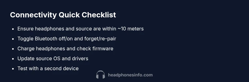 If you’re wondering how come my headphones won't connect, the answer typically comes down to pairing or software issues rather than physical damage. The most common culprits are Bluetooth pairing problems, outdated firmware, or interference from other devices. In this section we’ll outline the main failure modes and how to approach them quickly. Remember, in many cases a simple reset and re-pair fixes the problem, especially on mobile devices where OS updates can affect Bluetooth performance. Throughout, we’ll reference practical steps and the exact checks you can run to regain a solid connection. This is a practical, data-guided approach from the Headphones Info Team to help you move from chaos to a stable wireless link.