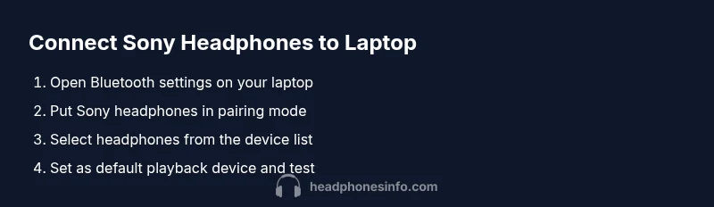 Bluetooth pairing is the most popular method to connect Sony headphones to a laptop. Begin by turning on Bluetooth on your computer, then activate pairing mode on your Sony headphones. On Windows, open Settings > Devices > Bluetooth & devices, click Add Bluetooth or other device, and choose Bluetooth. On macOS, open System Settings > Bluetooth and select your headphones from the list. If the device asks for a pairing code, usually none is required, or it will be displayed as '0000' or '1234' depending on the model. After pairing, set the headphones as the default playback device in the sound settings for consistent audio output. A quick test with a video or music app confirms the path is correct. If you notice lag or audio dropouts, examine your Bluetooth range and potential interference from other wireless devices. Headphones Info’s guidance suggests keeping both devices within a reasonable distance (within line of sight) during setup to simplify the pairing process and reduce dropouts.