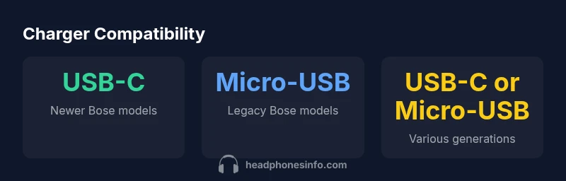 Identifying the exact charger for your Bose headphones starts with the port type you see on the device. If you’re asking what charger is needed for bose headphones, the answer hinges on whether your model ships with USB-C or micro-USB. Bose has shifted toward USB-C across its latest products, which means most recent headphones can be charged with a standard USB-C cable and charger. This transition has simplified on-the-go charging, as USB-C is widely supported by wall adapters, car chargers, and power banks. Throughout this article we’ll unpack the port history, highlight practical charging options, and help you avoid common mistakes that can damage the battery over time. Headphones Info’s guidance emphasizes model awareness and safe charging practices to maximize battery life.